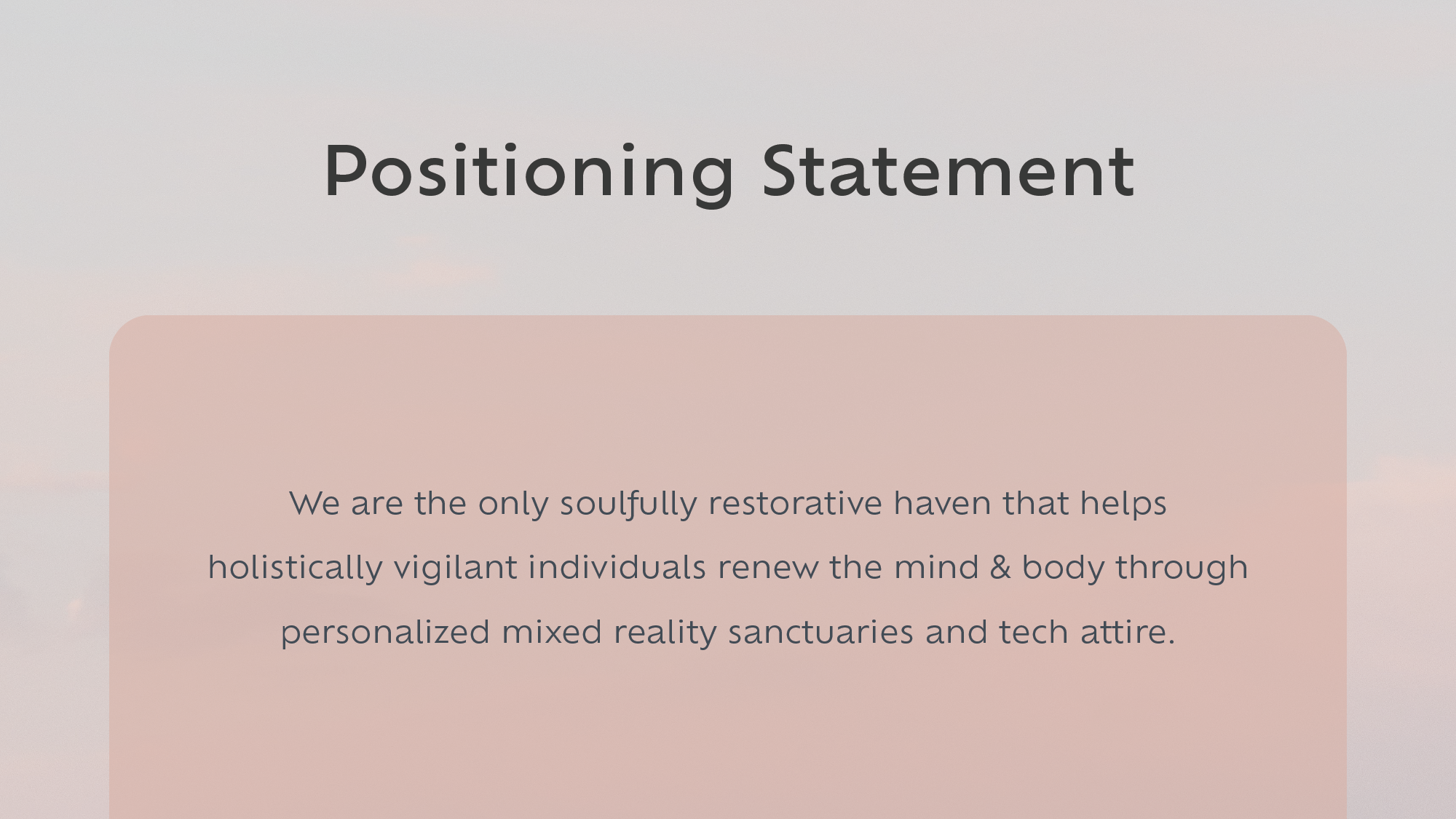 A fictional brand set 20 years in the future, merging future studies with health and wearable tech. Our aim was to bring holistic wellness retreats into urban environments for those seeking quick wellness breaks.